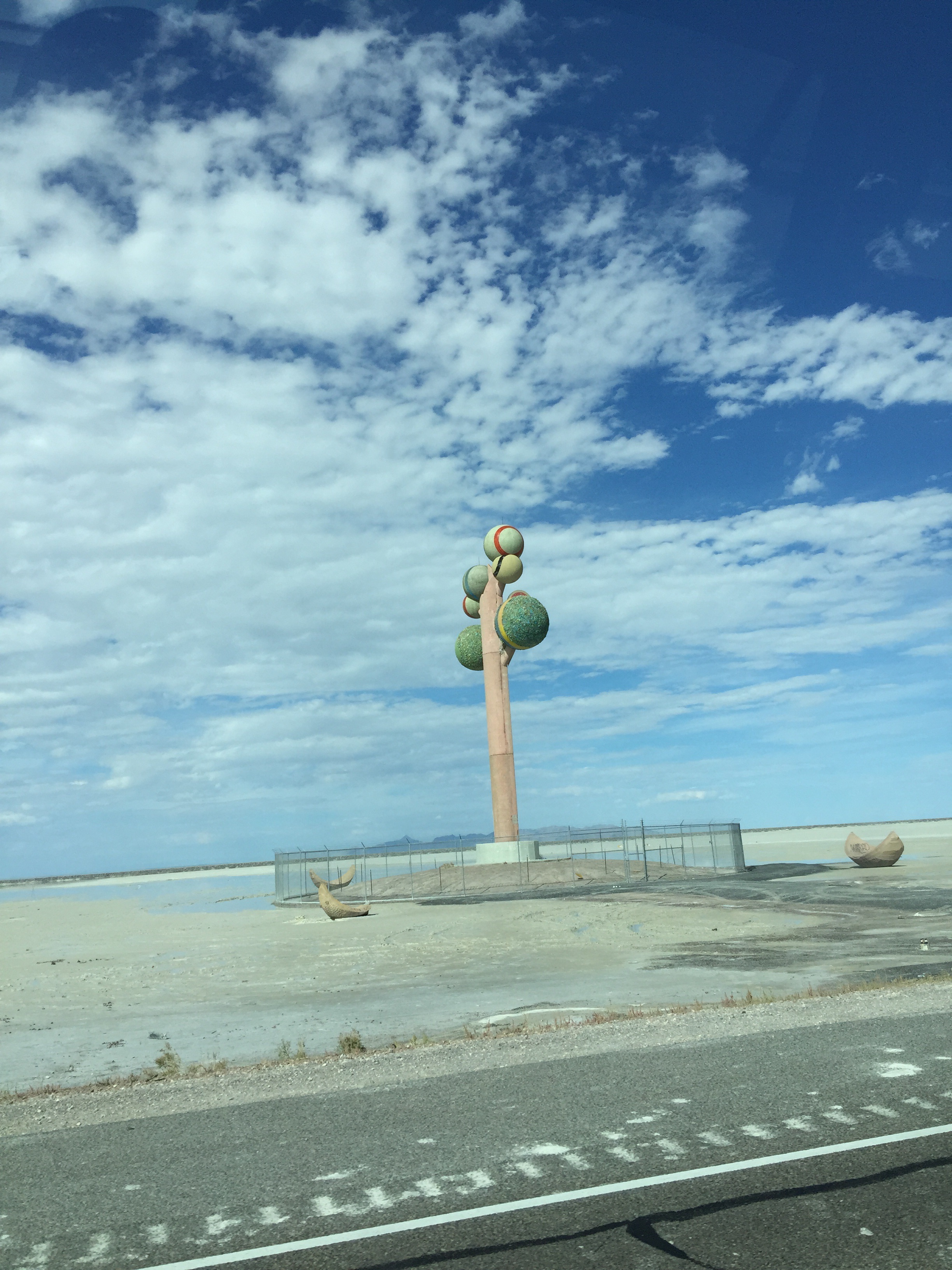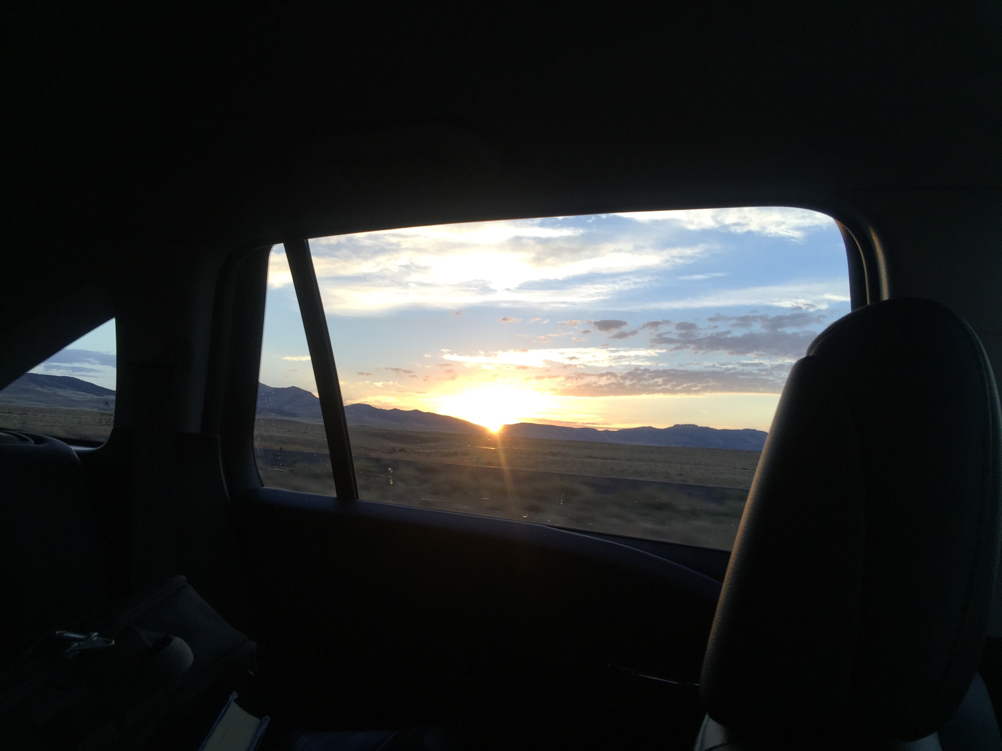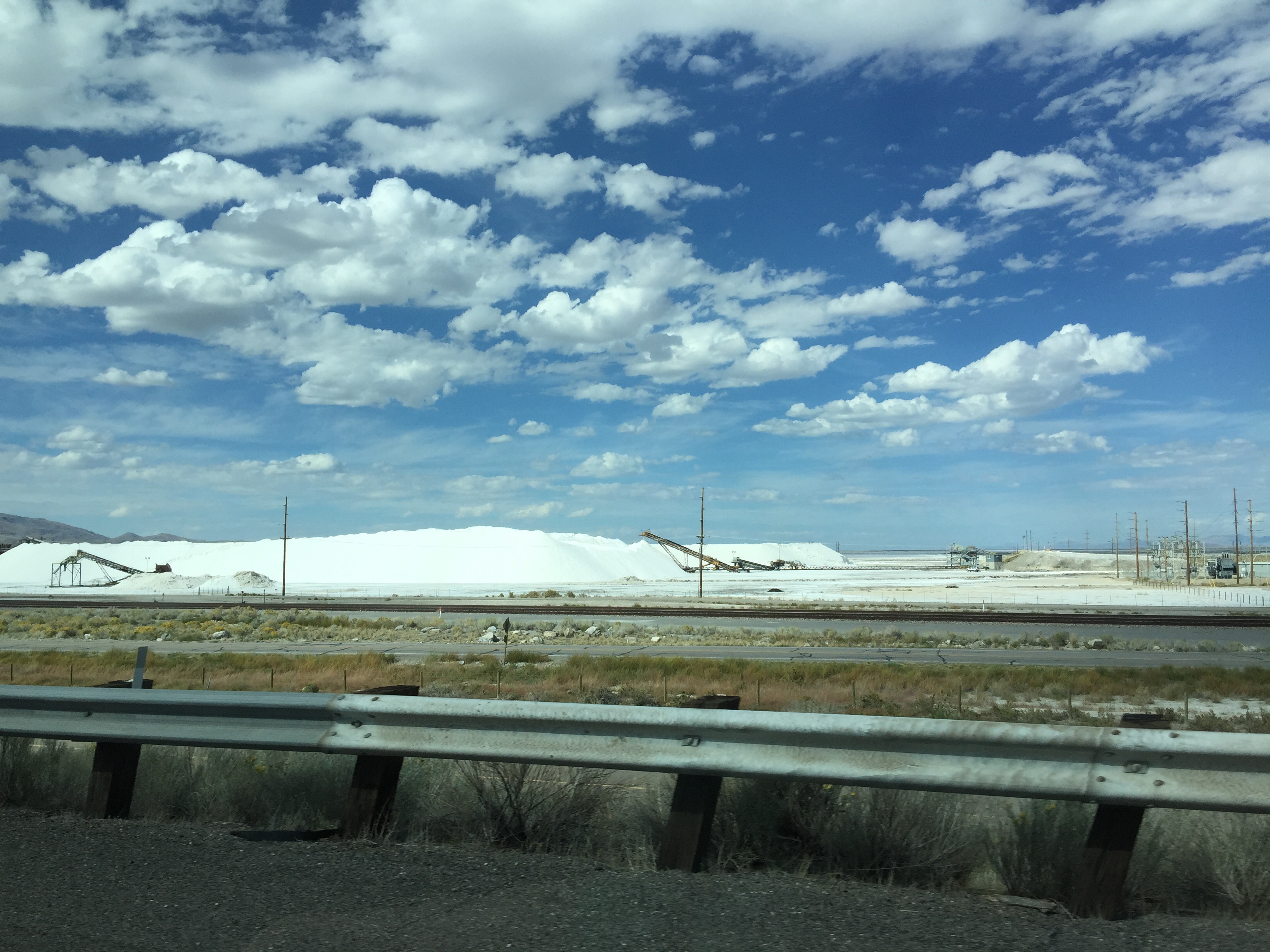 From there we got gas and I got a drive-thru Americano (good) and we were on the road for the next 10 plus hours only stopping for gas and potty.  Drove through Colorado to Utah and up to Salt Lake City and through Nevada.  Always weird to go by the salt flats.  The mound of salt is much bigger than when last drove by (Bob: “Baked potato!”)