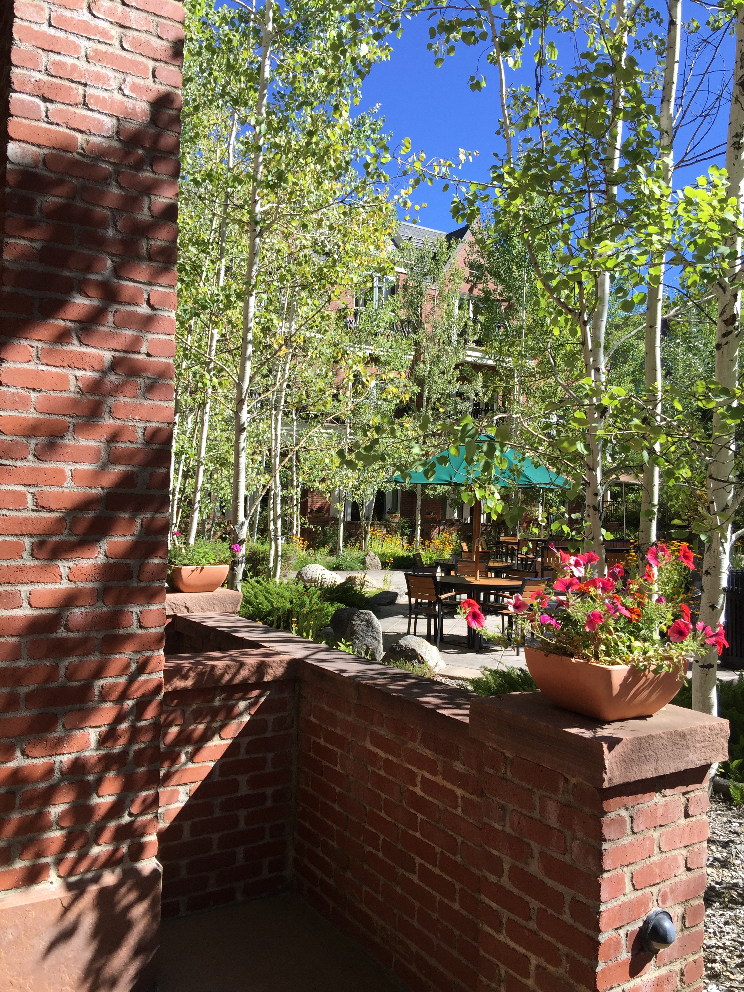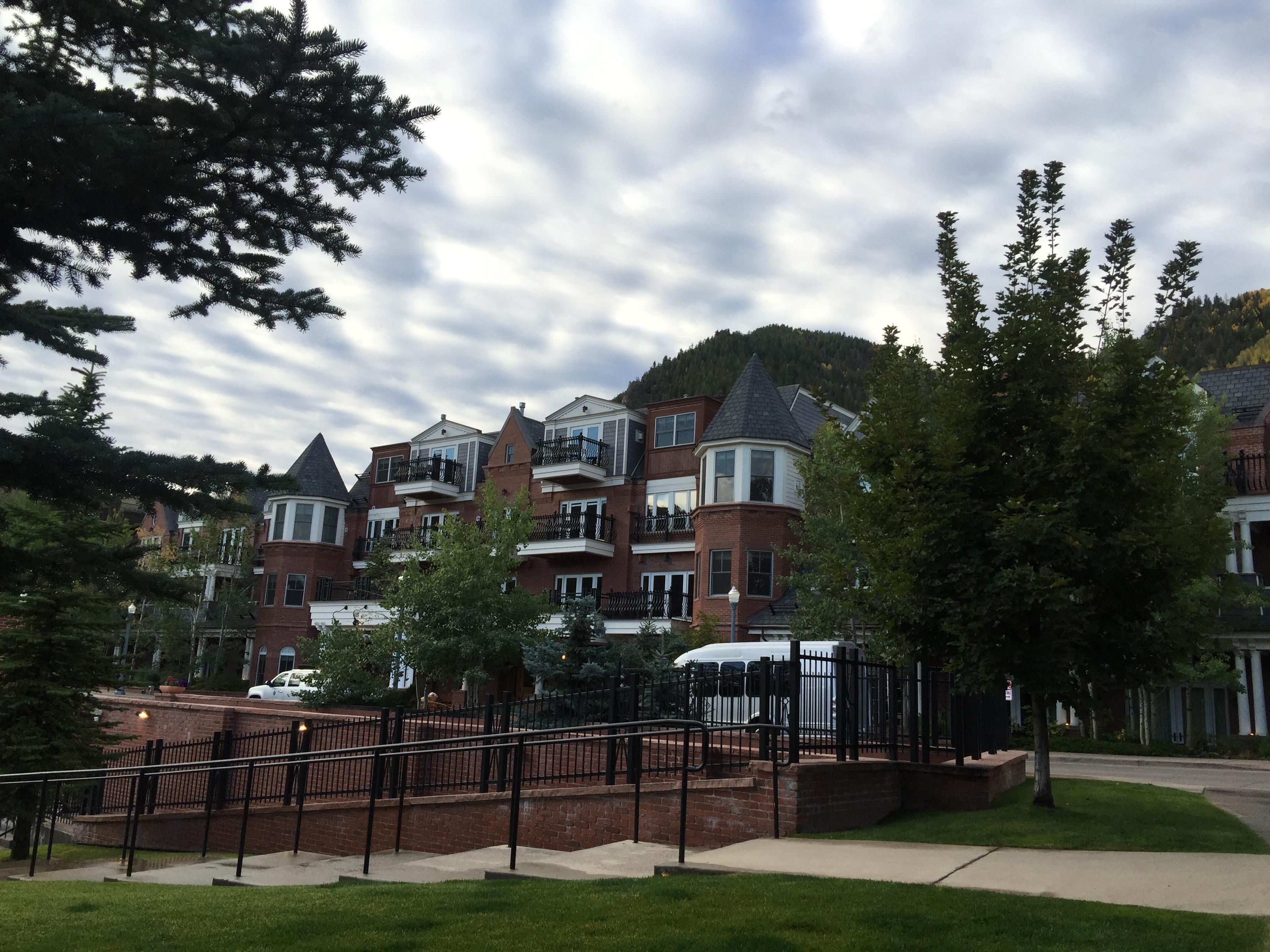Hate to leave our beautiful room and fun town of Aspen.  We had the car packed up and were at Paradise Bakery for the first time this visit by 8:15.  I walked down for my $6.56 latte around 7a and took these photos of the cottage cheese sky and the Hyatt.