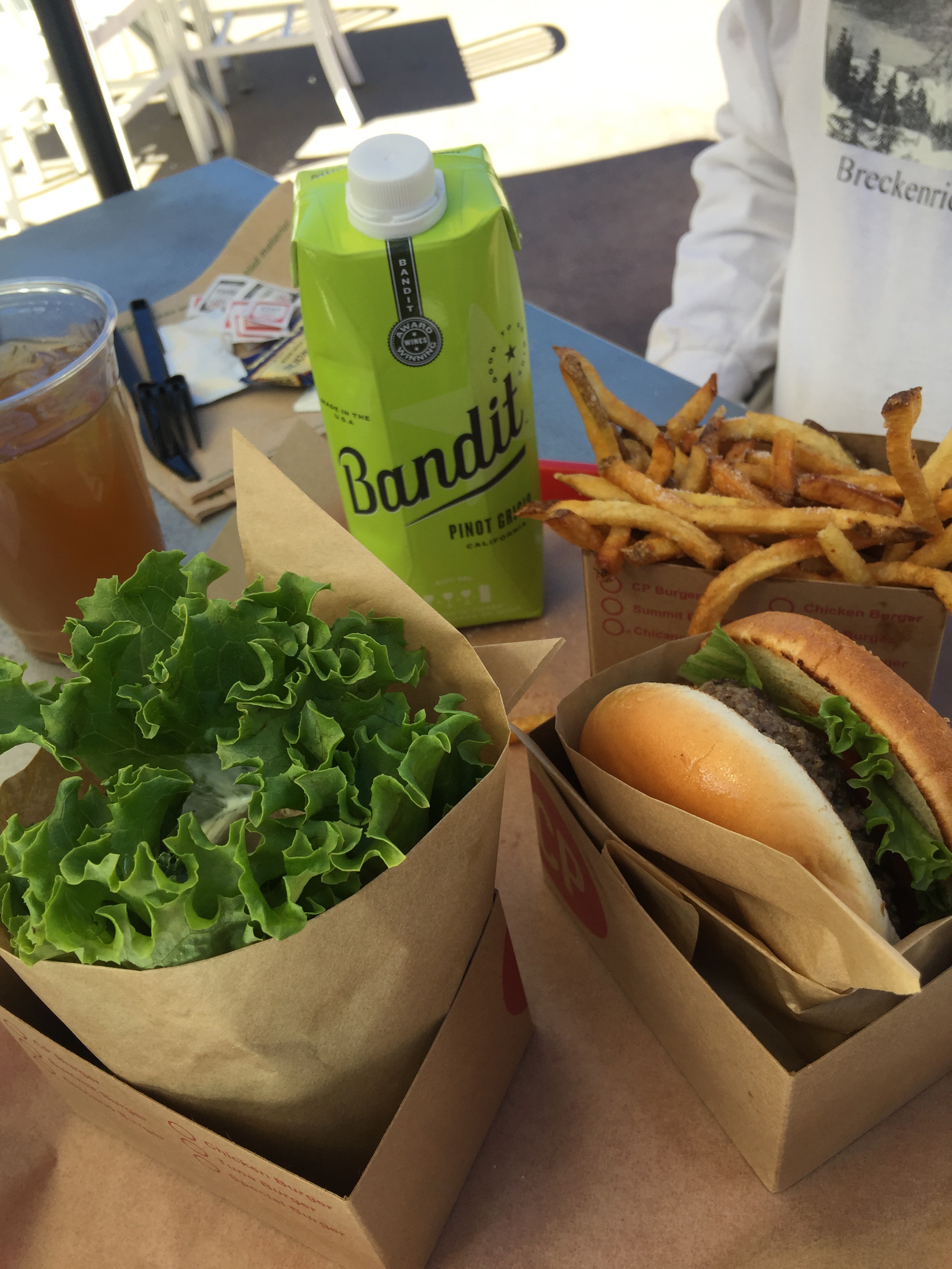 image image image imageWe got the bus back and went to CP Burger for lunch in the little plaza in front of the Hyatt.  Yum!  Bob got a regular burger with fries and a Pepsi.  I got tuna with tomato slices, onions, kale and a wasabi mayo wrapped in lettuce.  Really messy but really good.  Joel Gott Pinot Grigio in a box too.