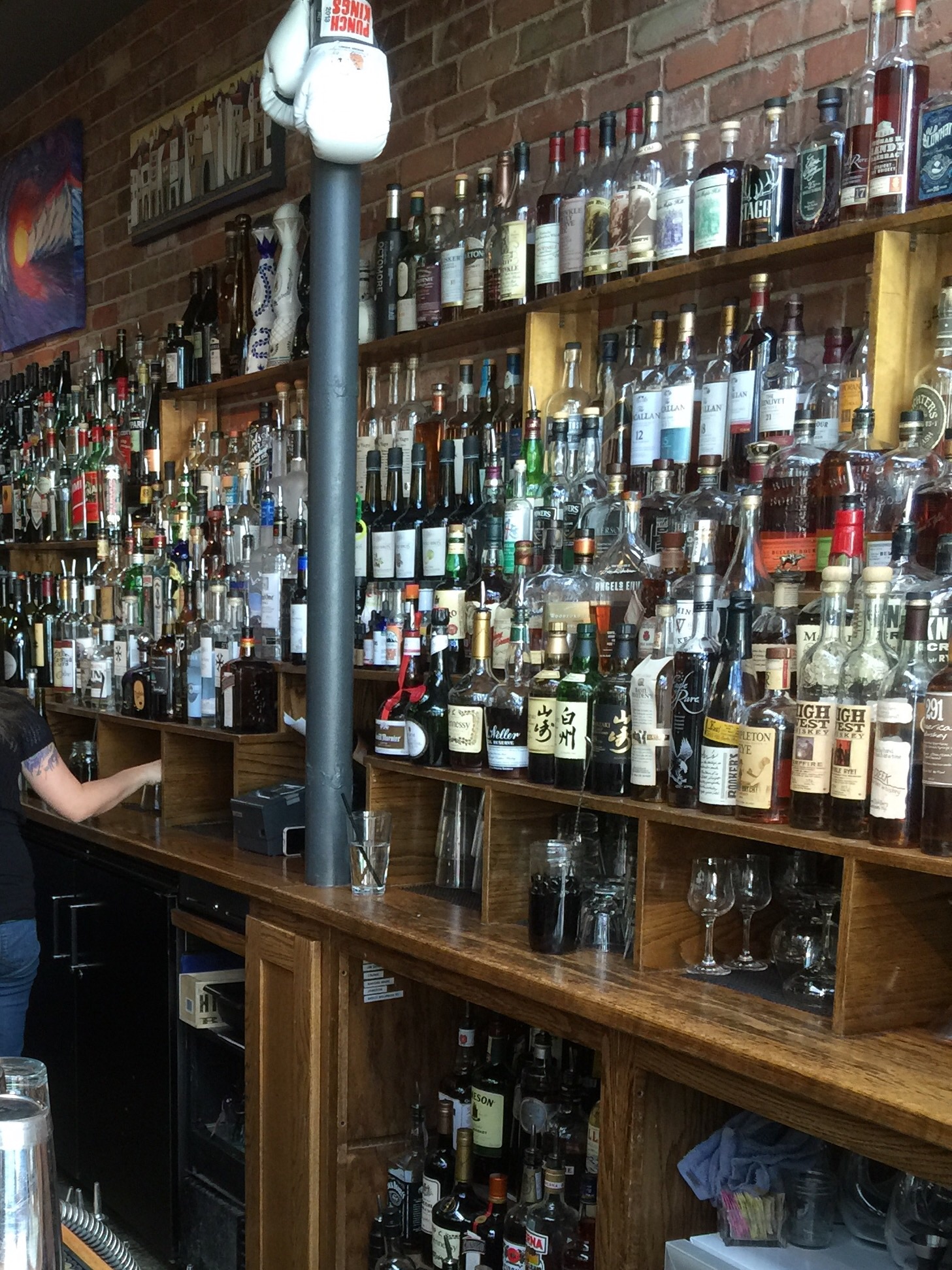 Got back to Breck about 2p and spent a couple of hours on email, etc.  Showered, dressed up (ha! jeans, clean shirts, cashmere sweater….) and set out.   Got two seats at the end of the bar at  Modis and ordered a Bourbon Smash for Bob (Bourbon, lime, mint, sugar and fresh seasonal fruit muddled) and a Manhattan (Bulleit rye, Carpano Antica and Angustura Bitters) for me.