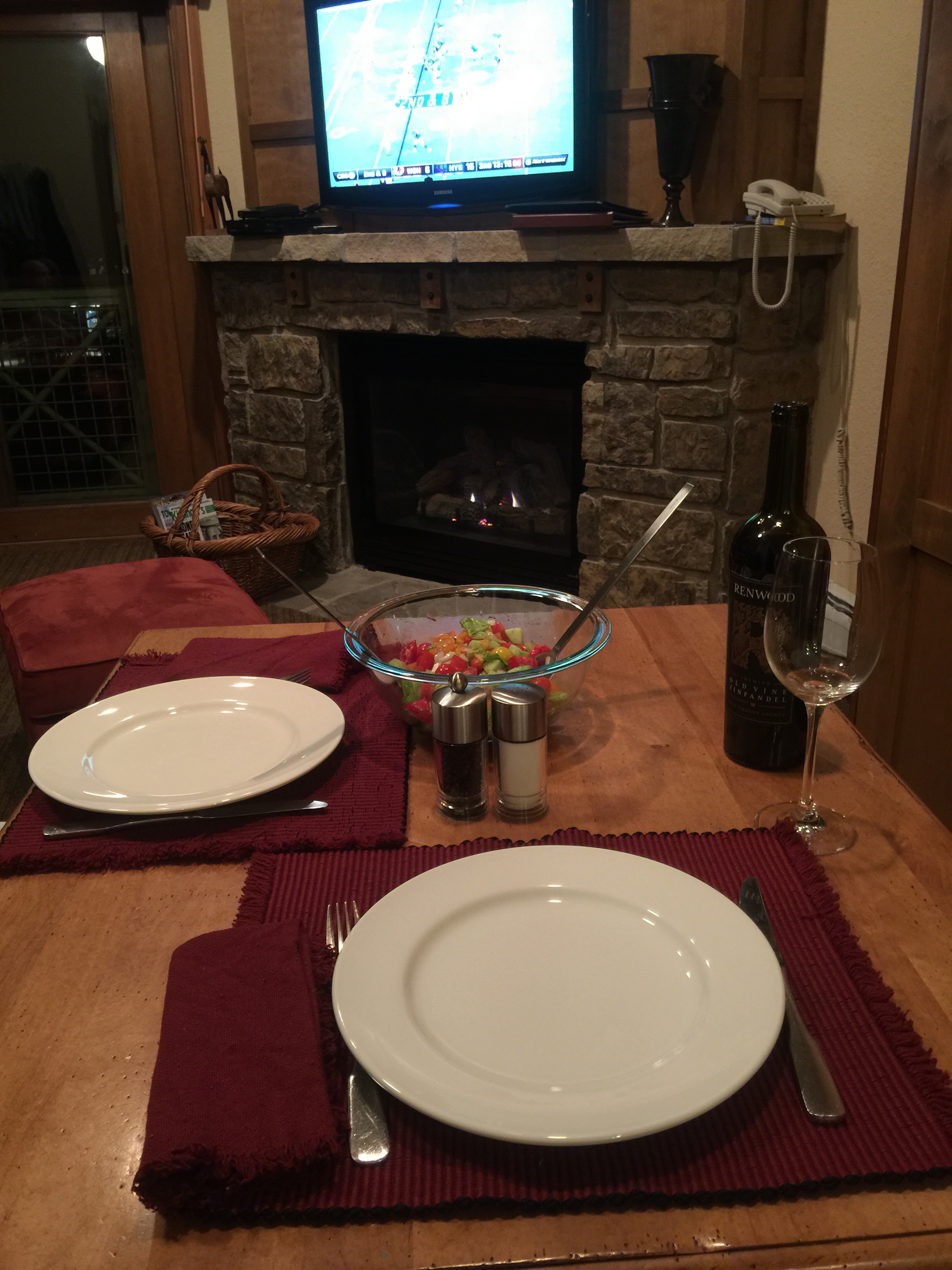 We hunkered down in the cabin lighting candles (Jo Malone freesia and pear in the living room and Myers Clean Day in the kitchen) and finding football games/scores. Baked chicken breasts for dinner with a baked potato and roasted sweet potatoes and broccoli and salad. The oven is way off and the chicken did not cook. The vegetables took way longer than usual but tasted good. Tomorrow: buy an oven thermometer.