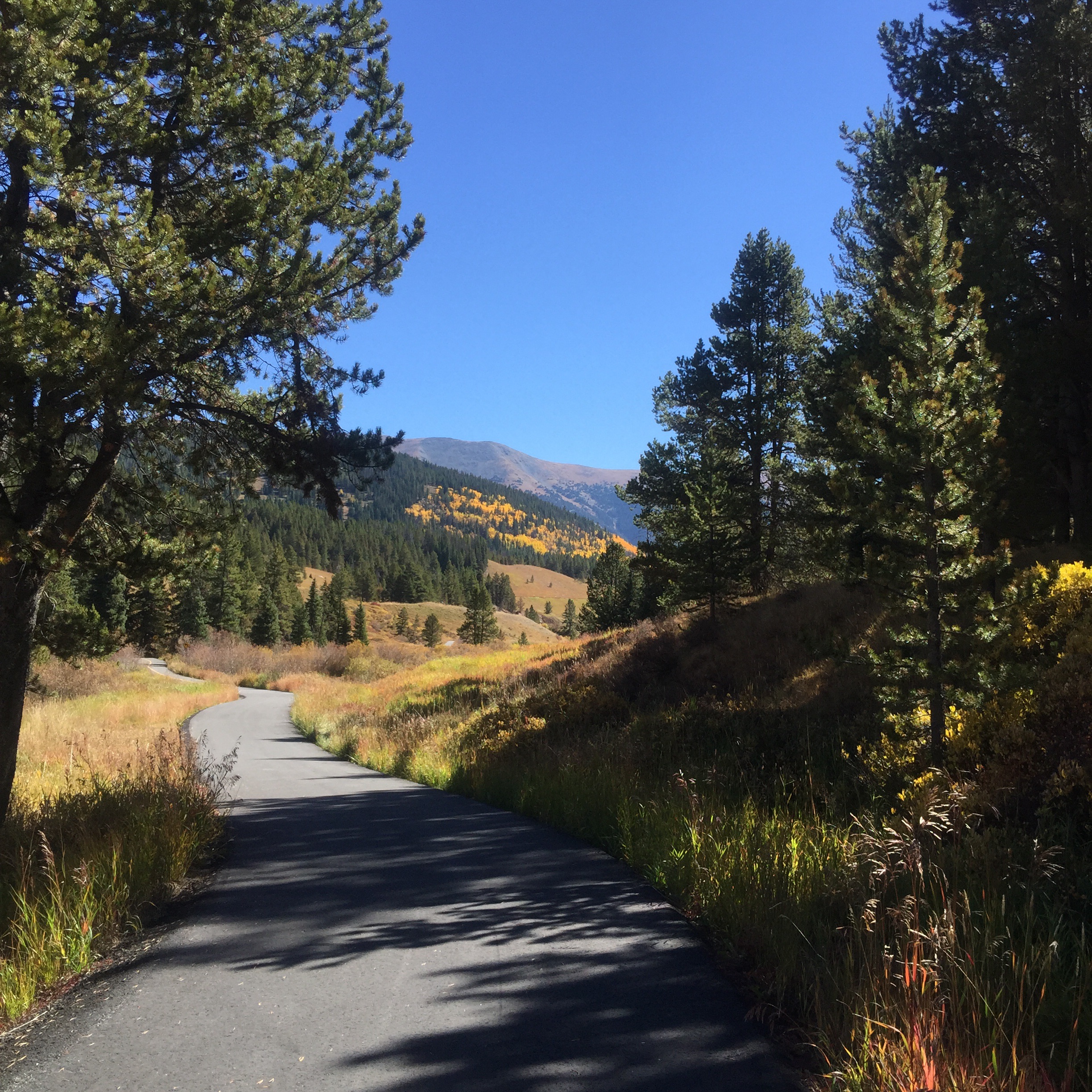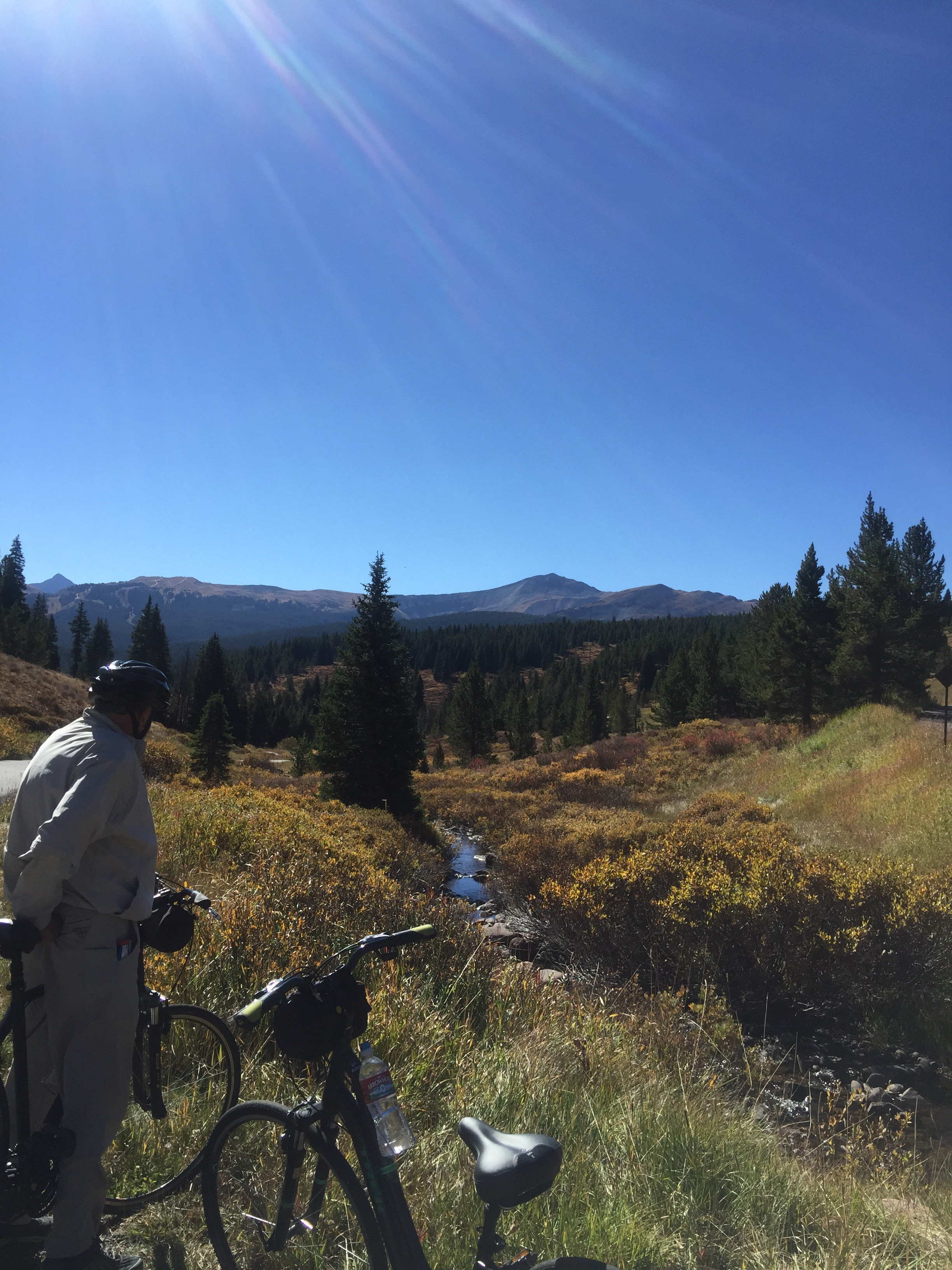 Got fitted on our bikes and followed the trailer over to Frisco where we parked our car and got in the van to be dropped off at Vail Pass.  The day today could not be more different than it was last August when we did this ride.  Bright sunny sky with not a hint of a cloud.  We were dressed in layers as it was in the high 40s/low 50s when we started (shorts, cotton t-shirt, thin cashmere long-sleeve, heavy cotton sweatshirt for me; I didn’t take off the sweatshirt until we got down to Frisco).  It is SUCH a great ride!  Obviously downhill so no exertion is required (though you do actually have to peddle the last 8 miles….) but so invigorating.  It was clear, crisp with gorgeous views every way you looked.  We stopped on the way down to take photos this time but we didn’t need to stop for fear of frostbite and hypothermia like last time.  We made it down in about an hour and a half.  Truly glorious.
